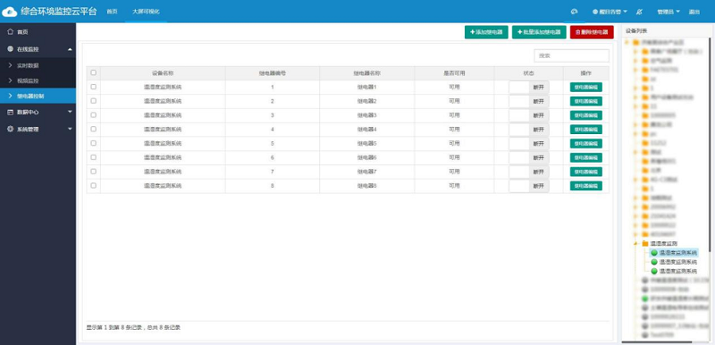支持電腦端、APP端遠(yuǎn)程手動/自動/定時(shí)控制現(xiàn)場繼電器設(shè)備,且繼電器名稱可自定義編輯,比如:配電室內(nèi)氣體濃度、溫濕度等任一數(shù)值超限告警時(shí),自動發(fā)送通風(fēng)命令給風(fēng)機(jī);每天早上八點(diǎn)和晚上十點(diǎn)定時(shí)啟動風(fēng)機(jī)通風(fēng)一小時(shí)等。