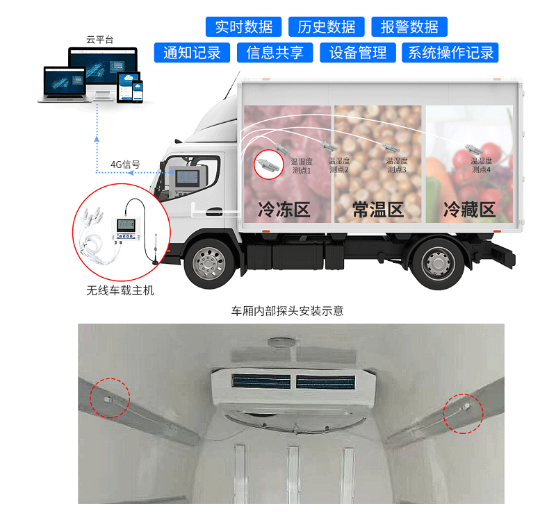 冷藏車溫濕度監(jiān)測(cè)系統(tǒng)(有線)由“4G車載多探頭溫濕度記錄儀+環(huán)境監(jiān)控云平臺(tái)”組成。4G車載溫濕度記錄儀的探頭可靈活布置于車廂內(nèi)的關(guān)鍵監(jiān)測(cè)點(diǎn)位,實(shí)現(xiàn)運(yùn)輸空間的多方位環(huán)境參數(shù)采集。探頭可通過高精度傳感器實(shí)時(shí)監(jiān)測(cè)所在位置的溫濕度數(shù)據(jù),通過有線傳輸方式將數(shù)據(jù)傳送至駕駛室內(nèi)的主機(jī)設(shè)備,滿足不同規(guī)格冷藏車的全方位監(jiān)控需求。主機(jī)在接收到數(shù)據(jù)后,會(huì)進(jìn)一步通過4G網(wǎng)絡(luò)將數(shù)據(jù)上傳至環(huán)境監(jiān)控云平臺(tái),實(shí)現(xiàn)數(shù)據(jù)的遠(yuǎn)程存儲(chǔ)、分析與共享,方便用戶隨時(shí)隨地查看運(yùn)輸過程中的溫濕度變化。
