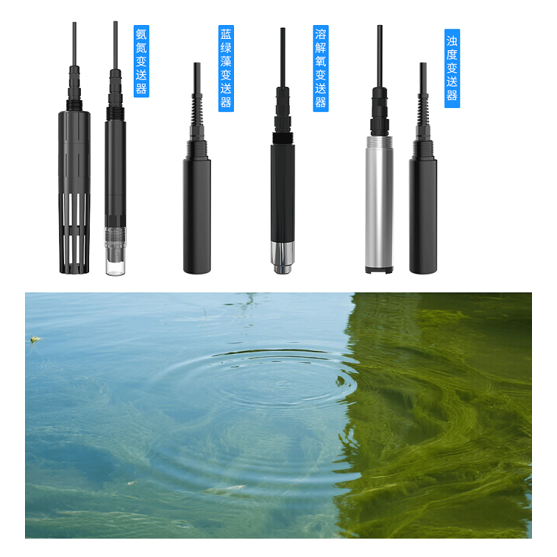 為應對藻類異常增殖及降解過程,管理人員可部署氨氮變送器、藍綠藻變送器、溶解氧變送器和濁度變送器構建綜合監測體系。其中:氨氮變送器實時監測水體中氨氮濃度變化;藍綠藻變送器幫助管理人員量化藻類生物量;溶解氧變送器動態追蹤溶解氧含量,及時預警水體缺氧風險;濁度變送器則通過監測水體透明度變化,間接反映藻類增殖或降解導致的懸浮物濃度變化。