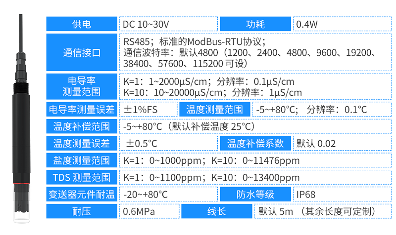 一體式EC變送器不僅能夠精確測量水體的導電性能,還具備鹽度與TDS(總溶解固體)的智能換算功能。此外,用戶還可以根據實際使用需求選擇寬量程一體式EC變送器(量程可達100000μS/cm)或采用四電極形式,抗極化能力更強,量程可達200000μS/cm的四電極EC變送器。