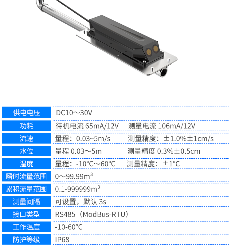 多普勒流速儀基于多普勒效應原理,通過分析超聲波頻率變化實現流速測量,并可同步監測水位及水體溫度,為水文監測提供多維數據支持。設備采用ABS工程塑料殼體,兼具良好的機械強度與防水密封性能;內部采用全電子設計,具備寬電壓供電能力和低功耗特性,并且無機械運動部件,顯著減少了故障隱患。此外,多普勒流速儀還可區分水流方向,區分統計正累計流量,負累計流量以及凈流量,為復雜水流環境的監測提供全面數據。多普勒流速儀體積小、重量輕,量程范圍寬,抗干擾能力強,可滿足多行業對流體流速的高精度測量需求,廣泛應用于明渠、河道及非滿管管道的流量監測工作。