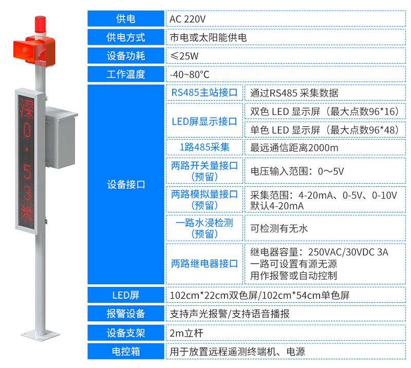 積水監測站主要是由遠程遙測終端(RTU)、語音播報模塊、光報警模塊及LED顯示屏等組成。設備搭配地埋式積水測點或電子水尺,可實時監測積水深度,并將數據實時顯示于現場LED屏幕上。一旦水位超過安全閾值,系統將自動觸發號筒揚聲器與光報警器進行聲光雙重報警,為城市排水防澇工作提供有效技術支持,顯著提升防災減災能力,保障城市安全穩定運行。