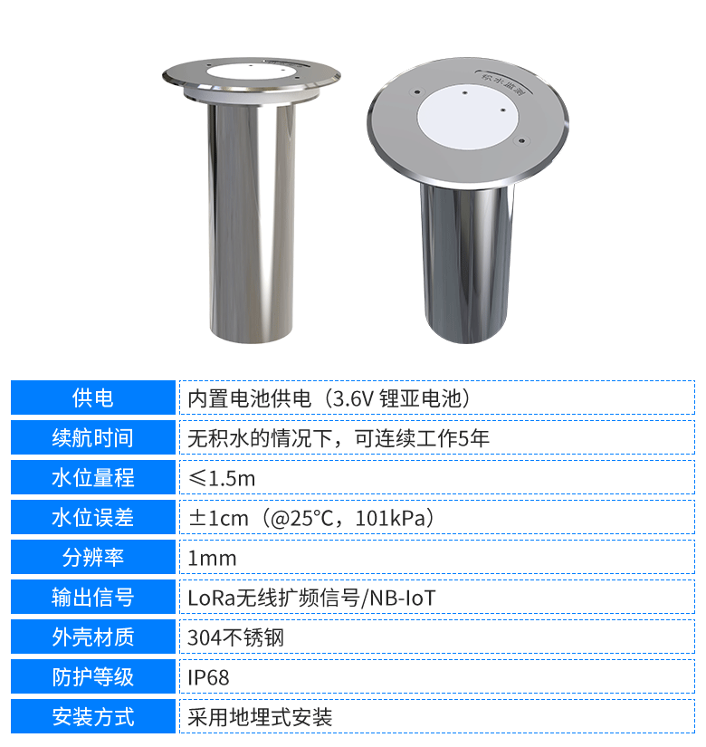 地埋式積水測點采用超聲波原理測量水位(包括積水深度與狀態)。設備外殼選用防水防腐的304不銹鋼材質,具備IP68防護等級,可常年穩定工作于室外環境中。內置鋰亞電池,功耗低,在無積水情況下可連續工作長達5年。采用地埋式安裝方式,外觀小巧、結構緊湊,便于施工部署。