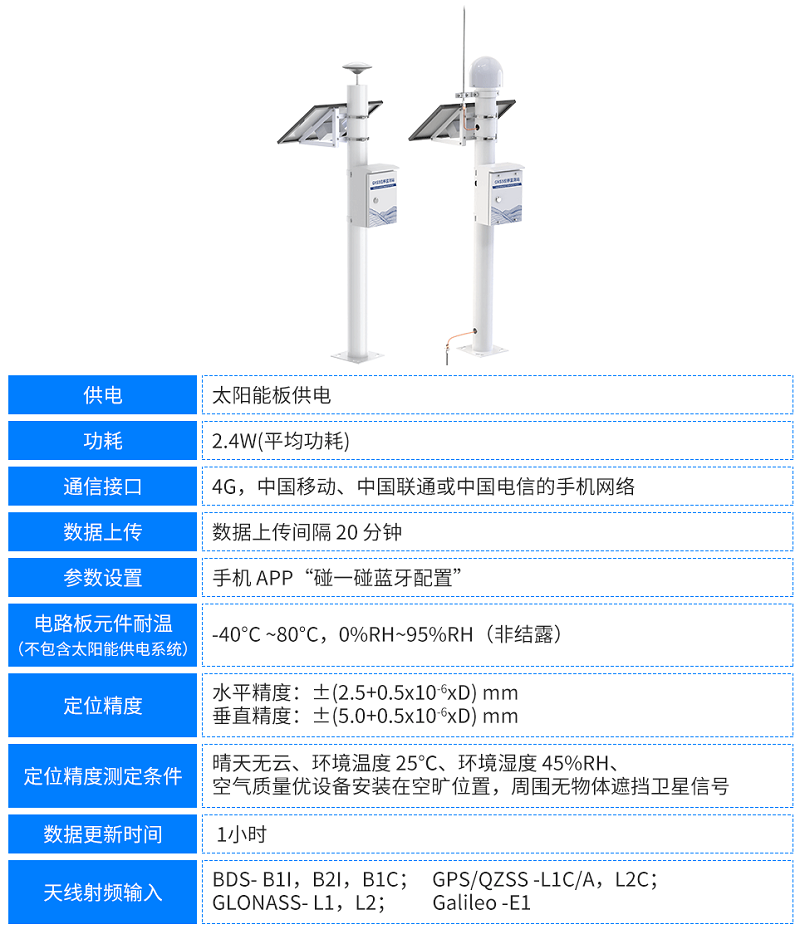 GNSS位移監測站可同時接收多系統、多頻率衛星信號,并實時上傳至解算平臺,具有毫米級定位精度,解算結果準確可靠。設備防護性能強,采用直徑114mm的加強立桿,并可選配天線罩與避雷針,適用于各類地表位移與建筑物形變監測場景,包括山體滑坡、邊坡、水庫大壩、礦山、尾礦庫、地面沉降、橋梁及公路鐵路等的監測。GNSS位移監測站具備精度高、功耗低、性價比高、安裝便捷、無需布線等優勢。