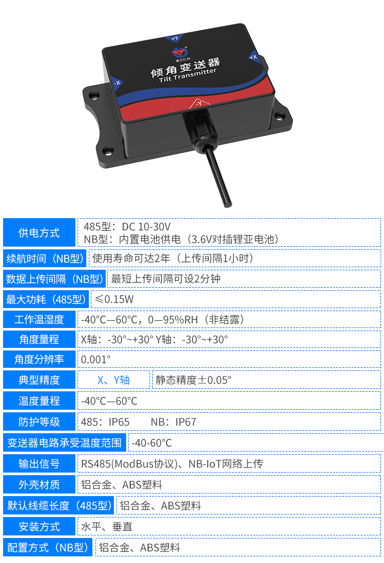 高精度傾角采集器是一款標準工業傾角儀。設備可實時監測X軸與Y軸的角度變化,并依托內置的高精度溫度芯片實現全量程溫度補償,從而有效抑制環境溫度干擾。其監測數據廣泛應用于危房監測、古建筑保護、隧道結構監測、稱重系統傾斜補償及鉆井傾斜控制等多個領域。該設備具有安全可靠、外形美觀、安裝便捷等特點。