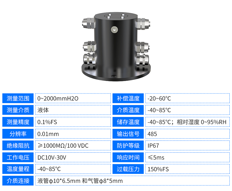 壓差式靜力水準儀搭載高精度壓力傳感器芯片,可實時監測數據變化。其具有0.01mm的超高分辨力,可有效監測微小沉降;通過數字化信號處理與溫度補償算法,可消除因環境溫差導致的傳感器漂移。產品采用金屬結構一體化設計,堅固耐用,防水防腐不易生銹,有效延長了使用壽命。