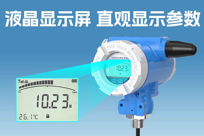 無線液位變送器自帶顯示屏,實現了監測數據與設備狀態的直觀可視化,可直接顯示當前液位數值、液體溫度、電池電量、通訊狀態等關鍵信息,不僅提升了數據查看的便捷性,還能幫助工作人員發現設備異常,及時開展維護,保障監測工作持續穩定。