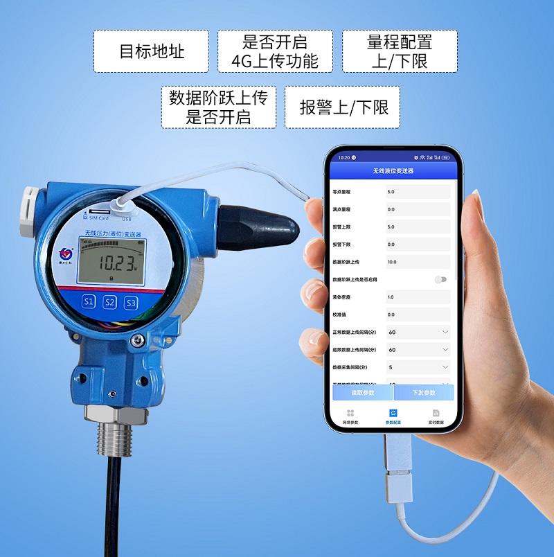 無線液位變送器支持 USB 連接手機 APP 進行參數設置,大幅簡化操作流程。工作人員只需在手機端打開專用 APP,即可直觀調整數據采集頻率、預警閾值等參數,界面簡潔易懂,無需專業知識。