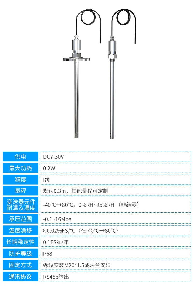 電容式液位計支持 RS485 有線傳輸,可通過標準工業總線實現數據的穩定上傳,適用于廠區內固定監測點、布線條件成熟的場景,能有效避免無線信號干擾導致的數據偏差,保障數據傳輸的連續性與準確性。