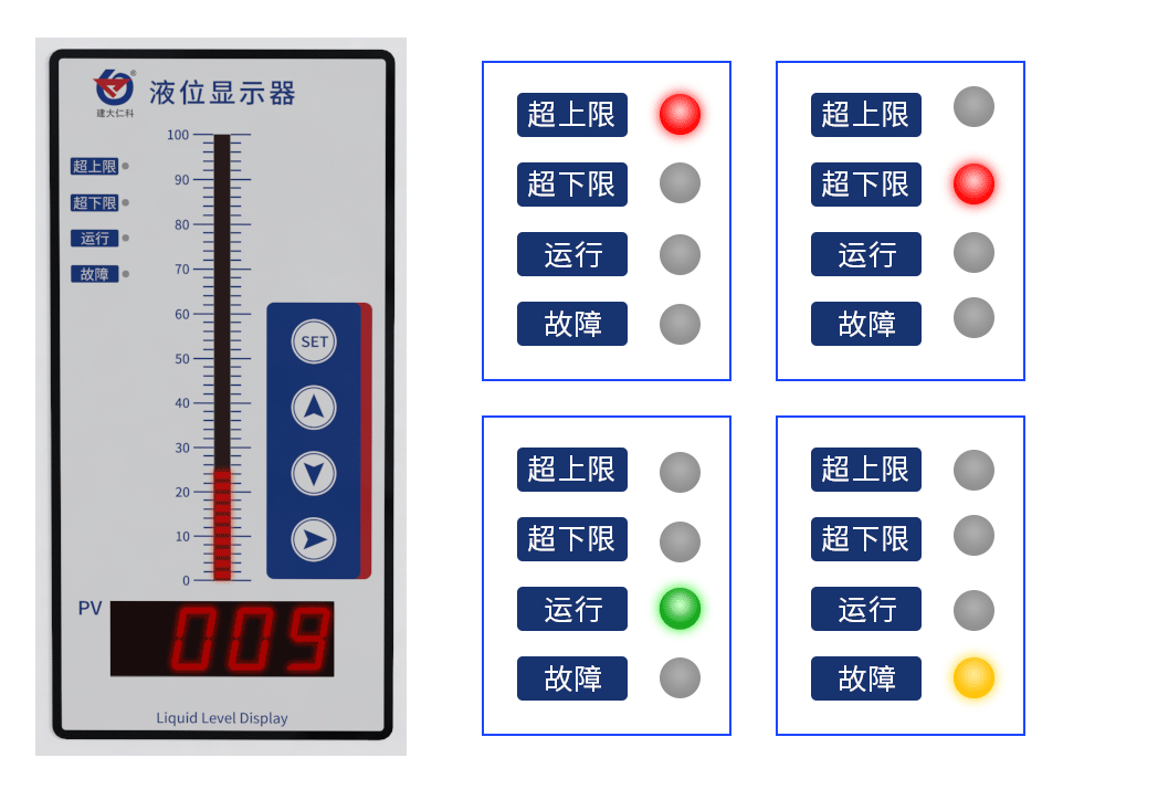 消防液位顯示器中帶有顯示面板指示燈:當水位超上限/超下限、設備運行正常/故障時,相應狀態的指示燈會亮起。