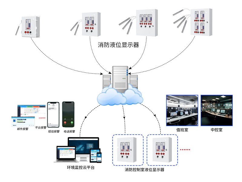 設備采用n+1布點模式,支持多測量終端靈活部署于各消防水箱、水池,可通過4G網絡將數據統一傳輸至中控室接收終端,實現了監測點的靈活擴展與集中化管理。同時,消防液位顯示器的數據也可直連云平臺,借助云端的數據存儲、分析與遠程監控能力,為消防系統提供智能決策支持。
