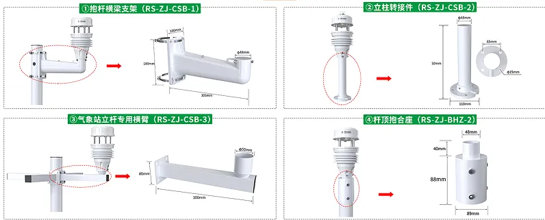 02 高級款設備在基礎款上額外配備立柱轉接件、氣象站立桿專用橫臂等安裝配件。