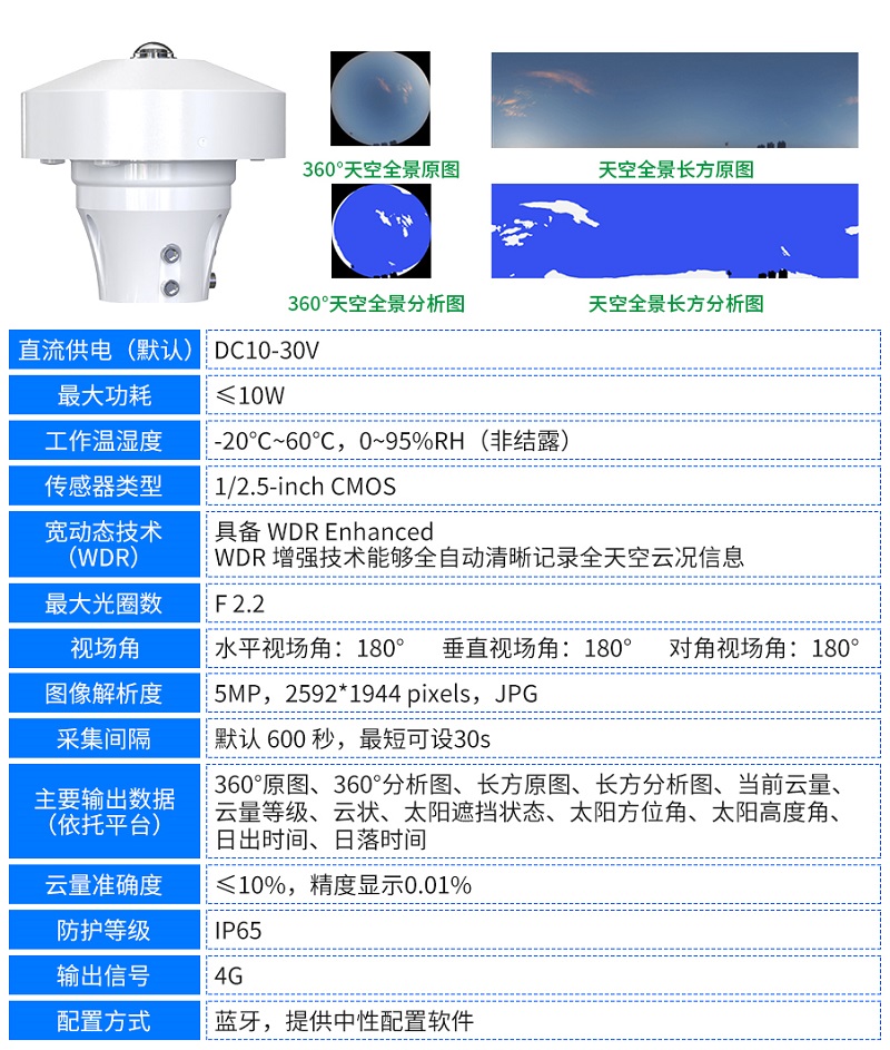 全天空成像儀具備180°超廣視角成像能力,無太陽遮擋裝置,能夠全面監測天空區域。在使用過程中,用戶不用多次調整安裝角度或移動設備就能實現對全天空景象的一次性完整監測,避免因視野局限導致天空區域遺漏,滿足氣象監測、環境觀測等領域對天空整體狀況進行全面監測的基礎需求。