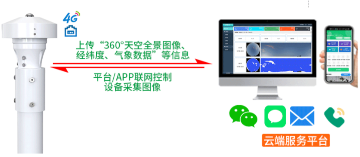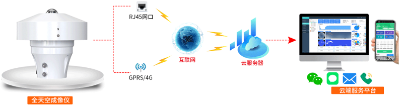 全天空成像儀支持通過4G無線傳輸和以太網有線傳輸兩種方式連接云平臺。用戶可根據監測站點的實際環境條件自主選擇合適的傳輸方式,采集到的全天空監測數據會實時、準確地傳輸至專用的云端服務平臺。