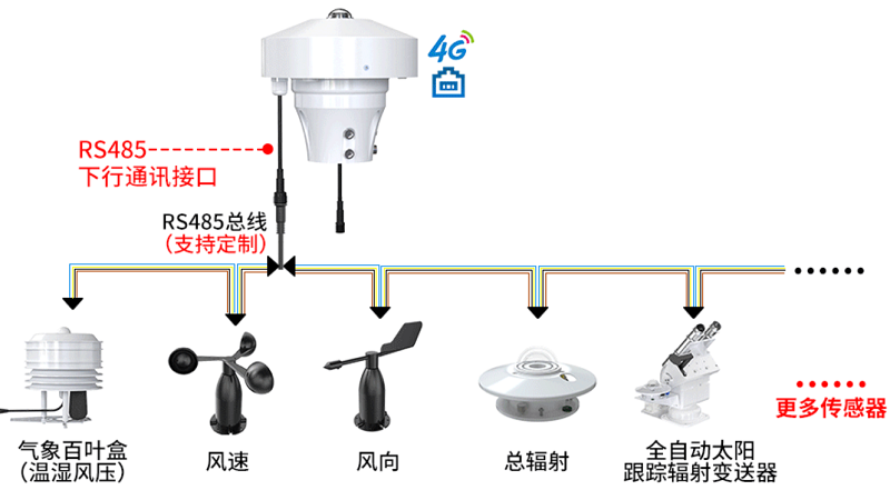 全天空成像儀具備靈活的功能擴展能力。通過選配RS485下行通訊接口,全天空成像儀可直接對接溫濕風壓、輻射等多種不同類型的氣象傳感器。