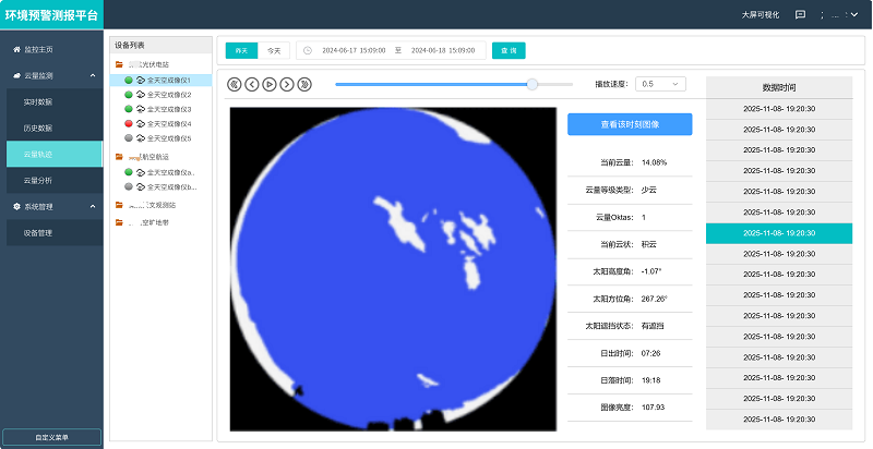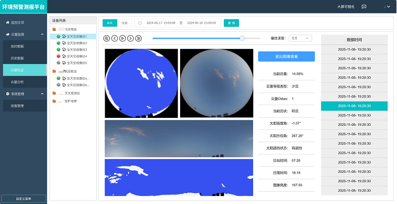 云端服務平臺可將不同時段的“360°天空全景原圖、360°天空全景分析圖、天空全景長方原圖、天空全景長方分析圖”按照時間進度進行播放,以此方便用戶分析云的軌跡變化,確定云的走向,預測太陽被云遮擋的情況。