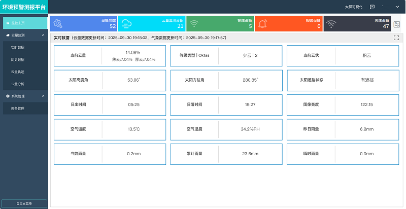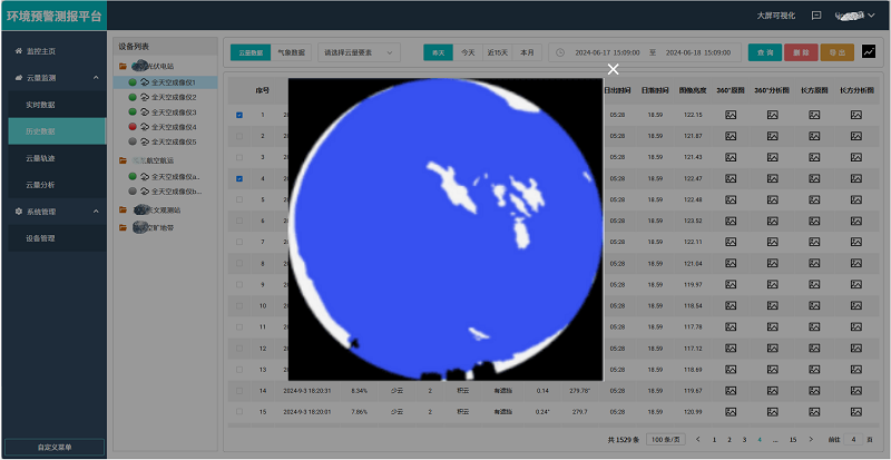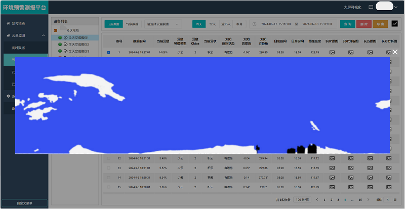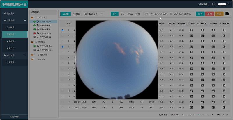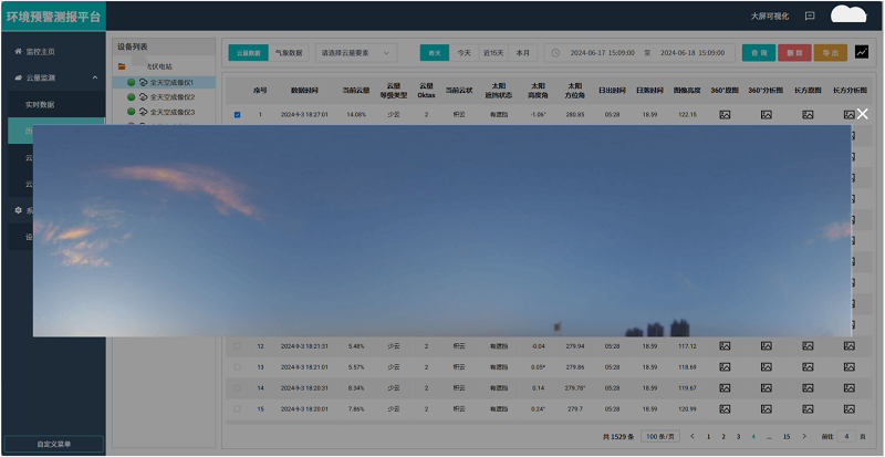 云端服務平臺支持對不同時刻的“總云量、云量等級、云量等級類型、云狀、太陽遮擋 狀態、圖像亮度、太陽高度角、方位角、日出日落時刻、氣象數據”進行查詢、導出、生成曲線,為事后溯源提供數據支撐。還支持對不同的“360°天空全景原圖、360°天空全景分析圖、天空全景長方原圖、天空全景長方分析圖”進行查詢、下載。