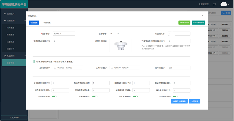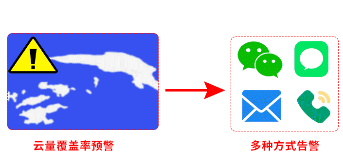 支持微信、短信、郵件、語音等告警方式實現“云量覆蓋率預警提醒”,系統可設置云量預警閾值,當滿足預警條件后,系統自動向指定用戶推送微信預警信息,方便用戶及時作出應對措施,起到預防預警的作用。
