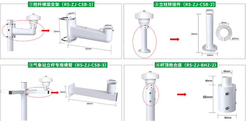 為滿足客戶的不同安裝需求,全天空成像儀支持抱桿橫梁支架、立柱轉接件、氣象站立桿專用橫臂、桿頂抱合座四種安裝支架,用戶可以依據實際情況自行選擇。