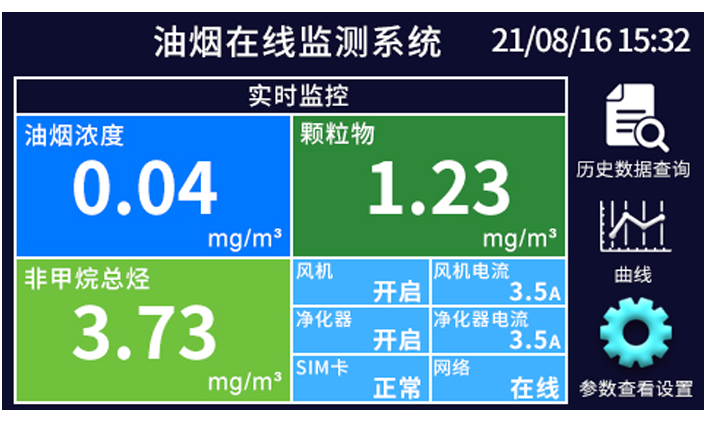 油煙檢測(cè)儀配備大屏觸摸屏,屏幕上可以實(shí)時(shí)直觀展現(xiàn)“當(dāng)前時(shí)間、sim卡狀態(tài)、網(wǎng)絡(luò)狀態(tài)、油煙濃度、顆粒物濃度、非甲烷總烴(NMHC)濃度、風(fēng)機(jī)及凈化器運(yùn)行狀態(tài)”等相關(guān)信息。 用戶還可通過(guò)觸控顯示屏實(shí)時(shí)查詢“油煙濃度、顆粒物濃度、非甲烷總烴濃度”的“歷史數(shù)據(jù)、近1h的曲線分析圖”。 此外,支持設(shè)置“系統(tǒng)工作時(shí)間段、通訊參數(shù)、隔膜泵啟停邏輯”等相關(guān)參數(shù)。