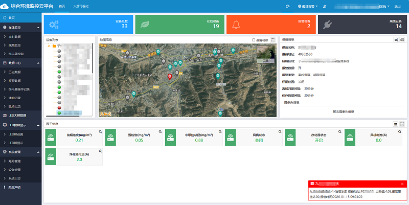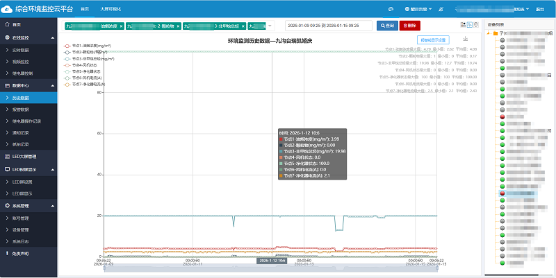 平臺(tái)擁有科技美觀的大屏界面,無(wú)需鼠標(biāo)操作即可自動(dòng)輪顯所有設(shè)備的監(jiān)測(cè)數(shù)據(jù),為用戶提供更加全面、直觀和高效的統(tǒng)計(jì)分析和監(jiān)控體驗(yàn),從而提升工作效率和決策能力。