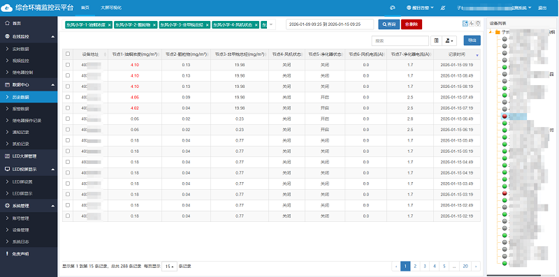 除了油煙檢測(cè)儀自身帶有的存儲(chǔ)功能,環(huán)境監(jiān)控云平臺(tái)也能夠?qū)ΡO(jiān)測(cè)數(shù)據(jù)進(jìn)行存儲(chǔ)。用戶能夠以表格/曲線的方式查看不同時(shí)間段的監(jiān)測(cè)數(shù)據(jù)、掌握歷史變化趨勢(shì)、統(tǒng)計(jì)報(bào)警次數(shù)、及時(shí)采取措施,避免因油煙排放量超標(biāo)而被處罰。