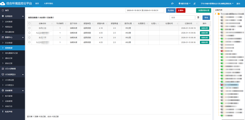 環(huán)境監(jiān)控云平臺(tái)擁有多種告警方式,當(dāng)油煙檢測(cè)儀監(jiān)測(cè)到的數(shù)據(jù)超過(guò)上限時(shí),平臺(tái)會(huì)以數(shù)據(jù)變紅、彈窗、聲音等形式提醒,還可以觸發(fā)短信、語(yǔ)音、郵件、微信推送等方式進(jìn)行遠(yuǎn)程告警,并自動(dòng)記錄告警信息,方便用戶隨時(shí)查詢。