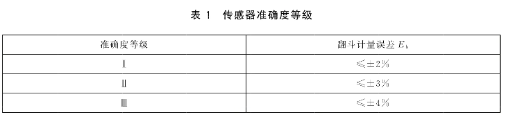 測量精度是國家行業(yè)標準重點規(guī)范的內容,《降水量觀測儀器(GB/T 21978.2- 2014)》中就明確指出,當降雨強度在0.01 mm/min~4.0 mm/min范圍內時,根據(jù)誤差大小,翻斗式傳感器的準確度會分為三個等級。