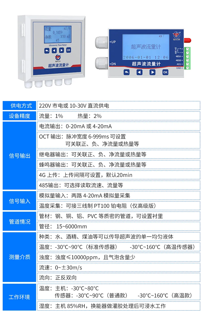 依據“熱力學公式”,利用測定的“體積流量、供回水溫差”等數據,結合流體的密度、比熱容等特性,設備可對管道內部“流體傳遞的熱量”進行積分運算,為區域供熱、中央空調冷熱計量以及工業過程熱能管理提供可靠的熱量數據,實現流量與熱量一體化監測。針對高溫工況需求,還有高溫款可供選擇,能夠監測-30℃~160℃的液體溫度,進一步提升了設備的實用性。