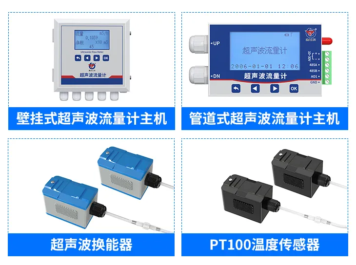 超聲波流量計主要由主機(壁掛式、管道式)、超聲波換能器以及PT100溫度傳感器三大部分構成,整套設備結構緊湊、配置可靠,能滿足工業流體流量與溫度的同步測量需求。