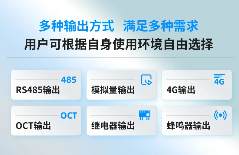 超聲波流量計主機配備多樣、實用的現場數據輸出接口,包含模擬量輸出、OCT脈沖輸出、RS485 通信輸出、繼電器輸出、蜂鳴器輸出和4G無線輸出方式。在實時采集原始數據后,主機會通過不同接口以對應形式向外傳輸數據信息,多種輸出方式可靈活匹配不同現場的采集設備、布線環境和使用需求,用戶不用再單獨搭配轉換裝置就能直接、穩定地獲取和傳輸流量計量數據,降低了現場安裝與系統對接的復雜度。