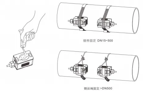 換能器安裝完成后,在換能器的發射面上,均勻涂抹 2~3mm 隨機附帶的耦合劑,然后按照安裝距離把換能器安裝在已經處理好的管道表面上,并用鋼帶或鋼絲繩固定。