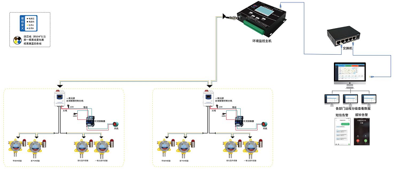 工作內容:智能環境監控主機通過RS485接口可接入氣體區域報警控制主體、防爆型溫濕度傳感器普通溫濕度傳感器、液位傳感器傳感器,實時監測各氣體濃度,當其中任一參數超過設定值時報警主機觸發報警,啟動短信、聲光報警,及時通知管理人員緊急處理。
