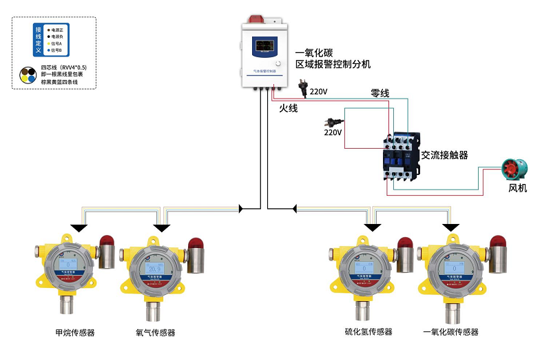 工作效果:防爆型硫化氫傳感器、防爆型一氧化碳傳感器、防爆型甲烷傳感器、防爆型氧氣傳感器通過RS485接口連接氣體區域報警控制主機,實時監測各氣體濃度,當其中任一氣體濃度高于設定值或氧氣濃度低于設定值時報警主機觸發報警,啟動聲光報警,并聯動風機等排風系統。
