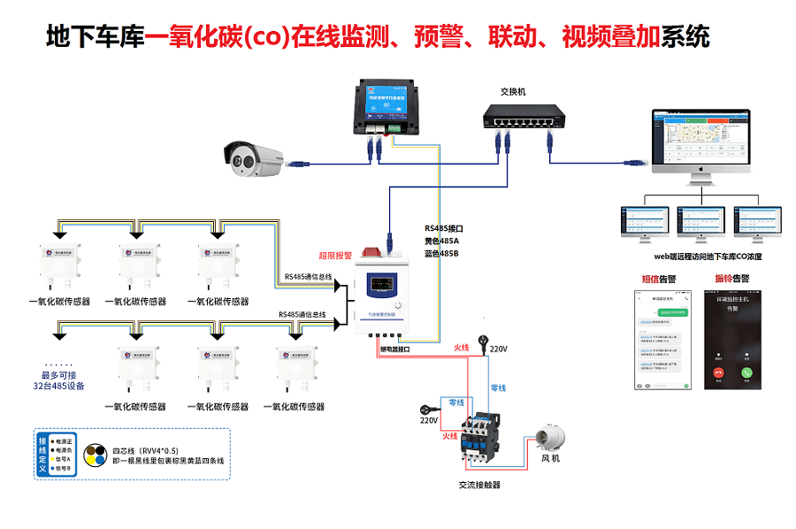 地下車庫一氧化碳(CO)在線監測、預警、聯動風機、視頻疊加一體化系統通過對地下車庫一氧化碳濃度的監測、控制完成對車庫內空氣的調節,以提高空氣質量;同時可以較大幅度地降低電能消耗,節約能