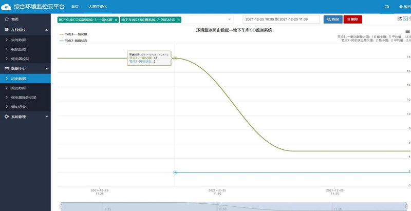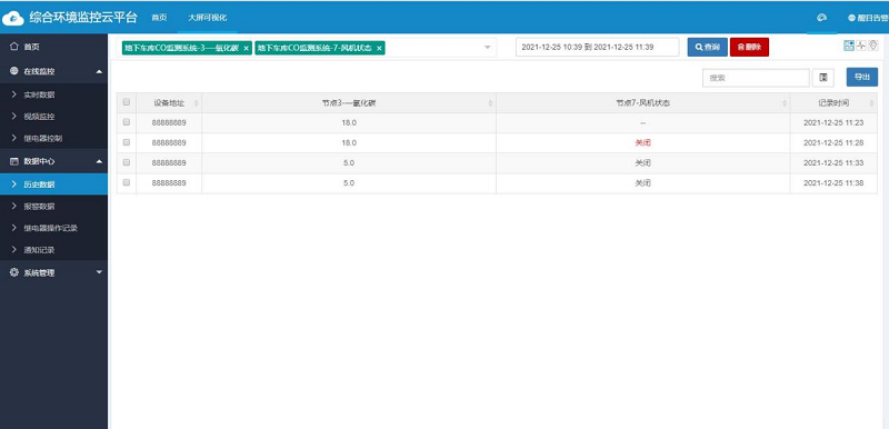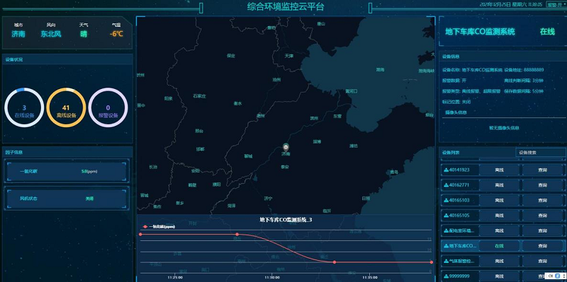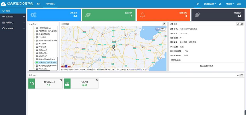 地下車庫一氧化碳(CO)在線監測、預警、聯動風機、視頻疊加一體化系統中的數據均由綜合環境監控云平臺處理。在軟件頁面中,支持樹形結構展示,支持在線設備、報警設備、離線設備快速篩選。可通過快捷方式快速查看、修改設備信息,查詢實時、歷史、報警數據,支持數據曲線分析,并提供數據的下載分析功能。