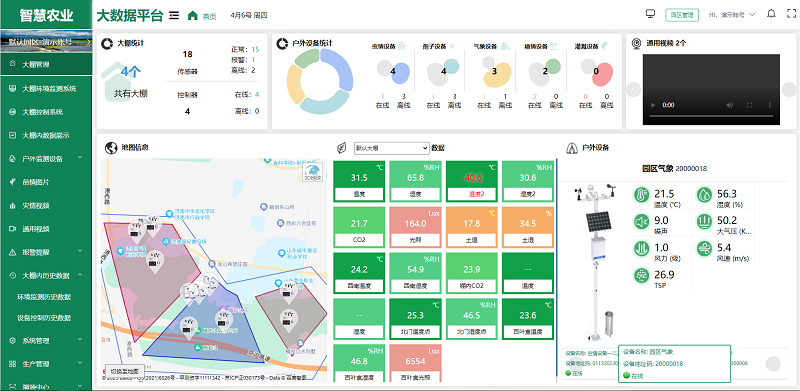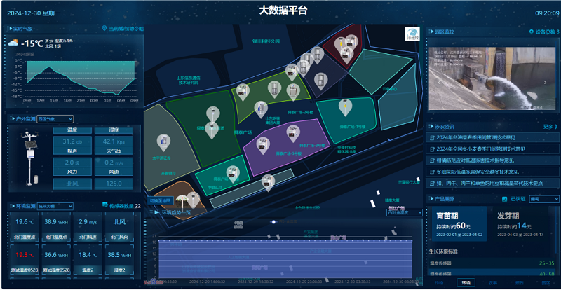 平臺的大屏可視化界面能夠科技直觀的輪顯園區內設備數據和曲線,同時展現了園區的天氣狀況、地圖規劃和設備點位、攝像頭畫面、農業資訊、溯源信息等,功能強大的同時,視覺上炫酷高級,信息上直觀突出,達到了科技感與實用性并存的效果。