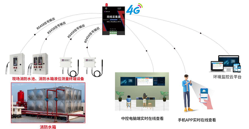 該系統(tǒng)由消防液位顯示器、RS485王字殼單溫度變送器、4G型網(wǎng)絡(luò)數(shù)據(jù)采集器以及綜合環(huán)境監(jiān)控云平臺(tái)組成,該系統(tǒng)通過安裝消防液位顯示器(包括液位傳感器以及液位顯示器)對(duì)消防水源設(shè)備的水位高度進(jìn)行實(shí)時(shí)監(jiān)測(cè),將液位信號(hào)轉(zhuǎn)化為電信號(hào),數(shù)據(jù)高亮實(shí)時(shí)顯示,同時(shí)傳輸?shù)较揽刂剖以贫似脚_(tái),從而實(shí)現(xiàn)遠(yuǎn)程監(jiān)控;通過單溫度變送器對(duì)消防水源設(shè)備的水溫進(jìn)行實(shí)時(shí)監(jiān)測(cè),可以及時(shí)發(fā)現(xiàn)水溫過高或過低的情況,防止因水溫異常導(dǎo)致滅火效果下降甚至失效,滅火設(shè)備損壞等問題。通過實(shí)時(shí)監(jiān)測(cè)液位高度和水溫,可以全面了解消防水源設(shè)備的運(yùn)行狀態(tài),系統(tǒng)一旦“捕捉”到消防水箱/水池水位超標(biāo)或者溫度異常的“信號(hào)”,就會(huì)自動(dòng)發(fā)出蜂鳴報(bào)警并將采集到的“RS485信號(hào)”通過4G網(wǎng)絡(luò)采集器轉(zhuǎn)換為4G通信的方式上傳至綜合環(huán)境監(jiān)控云平臺(tái),同時(shí)以短信、語音、郵箱等形式通知后臺(tái)管理人員,提醒管理人員及時(shí)采取補(bǔ)水等措施,確保消防水源設(shè)備始終保持在良好的工作狀態(tài)。最大限度的減少消防安全事故損失和事故造成的負(fù)面影響,保障人民群眾的生命財(cái)產(chǎn)安全。
