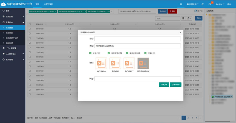 可查詢一個(gè)或多個(gè)監(jiān)測(cè)點(diǎn)的歷史數(shù)據(jù)、報(bào)警數(shù)據(jù),根據(jù)需要選擇相應(yīng)的監(jiān)測(cè)點(diǎn)、時(shí)間范圍和數(shù)據(jù)類型進(jìn)行查詢。支持PDF、Excel等多種數(shù)據(jù)格式導(dǎo)出,導(dǎo)出內(nèi)容標(biāo)題、使用單位名稱用戶可自定義,同時(shí)可導(dǎo)出數(shù)據(jù)查詢的時(shí)間段、查詢數(shù)據(jù)賬號(hào)、保存數(shù)據(jù)間隔、離線判斷間隔等重要信息。