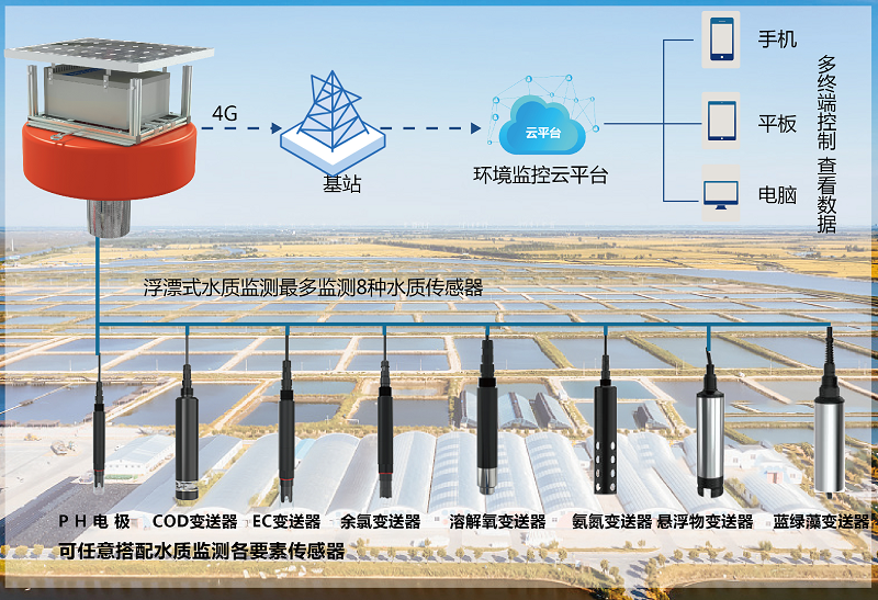 太陽能浮漂系統由基礎支架、供電系統、監測系統三部分組成,適用于水產養殖、污水處理、公園水質、野外地表水質等不易進行立桿安裝、市電供電或水面較廣的場合使用。